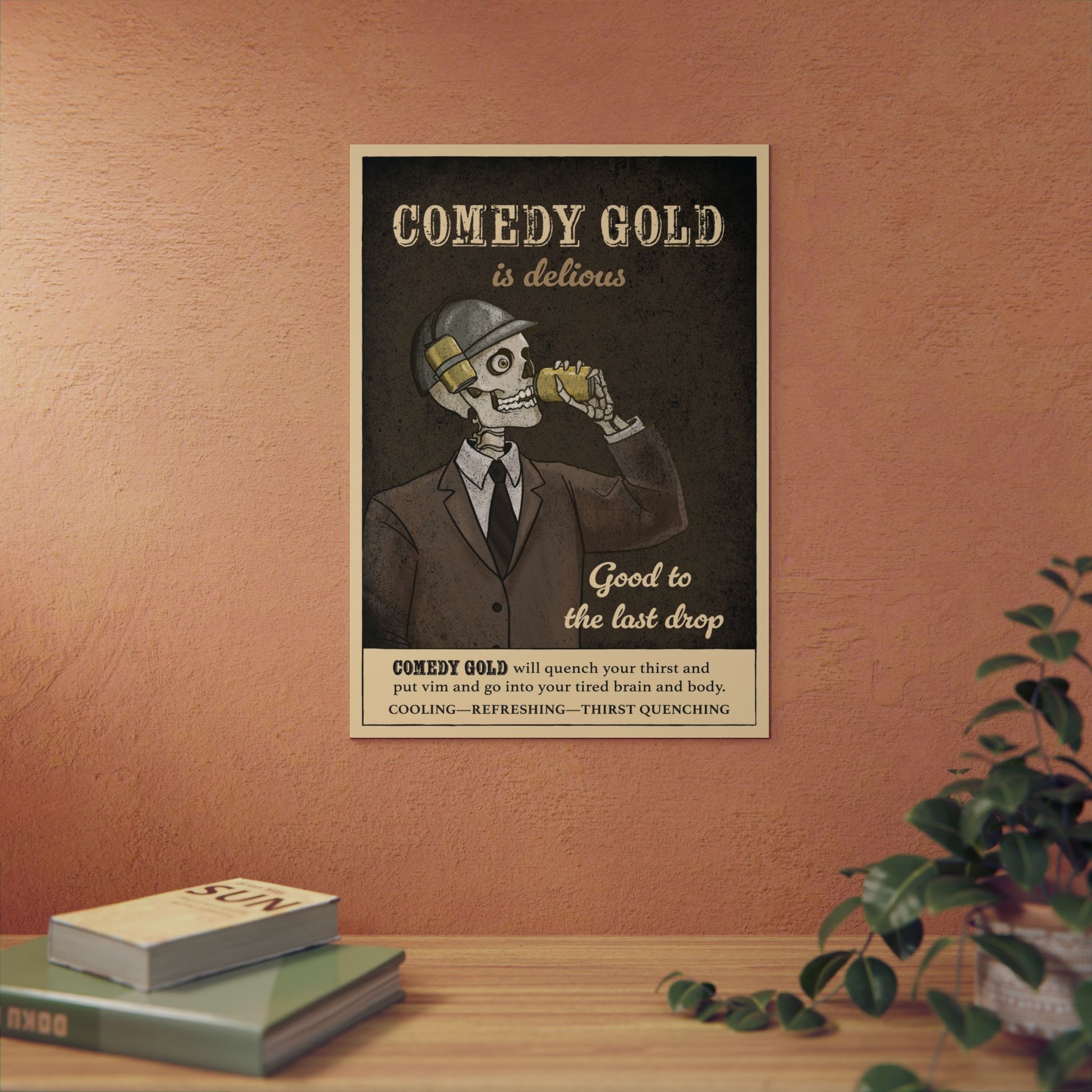 Comedy Gold Poster Aluminum Panel — Retro Skeleton Beverage Art